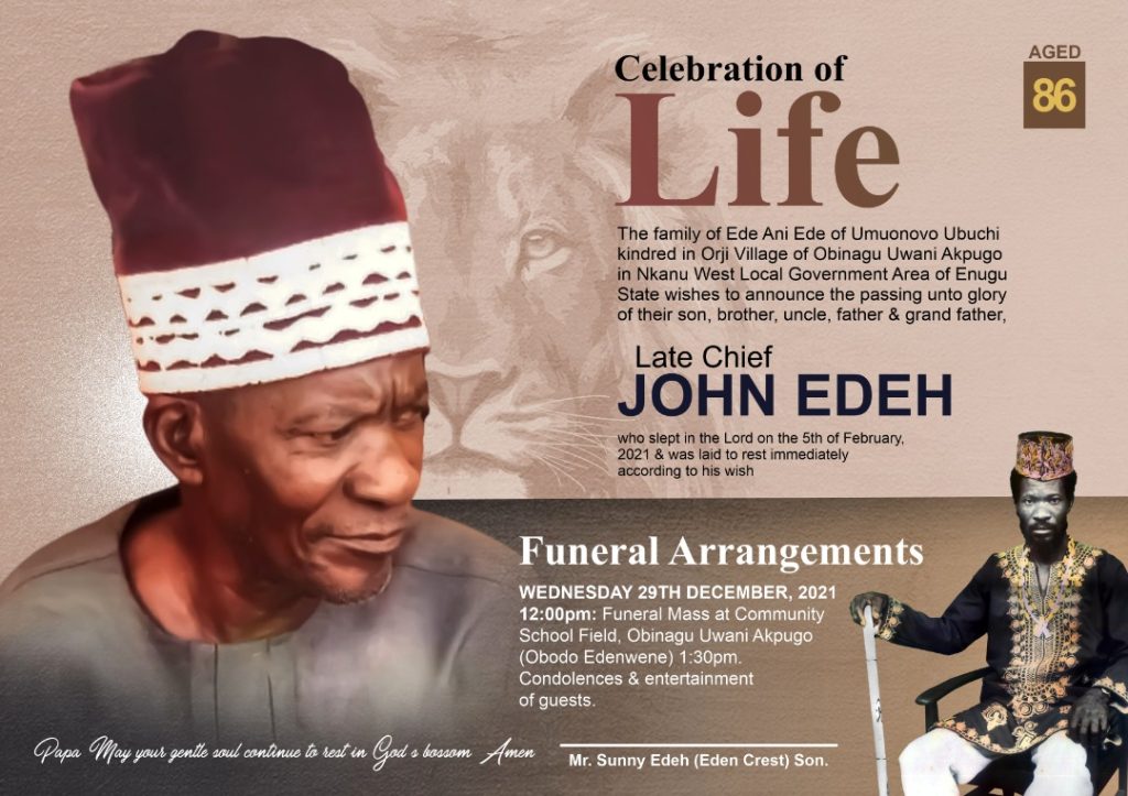 The family of Ede Ani Ede of Umuonovo Ubuchi kindred in Orji village of Obiagu Uwani Akpugo in Nkanu West LGA has announced December 29, 2021 for the funeral ceremony of their son, brother, uncle father and grand father Late Chief John Ede.