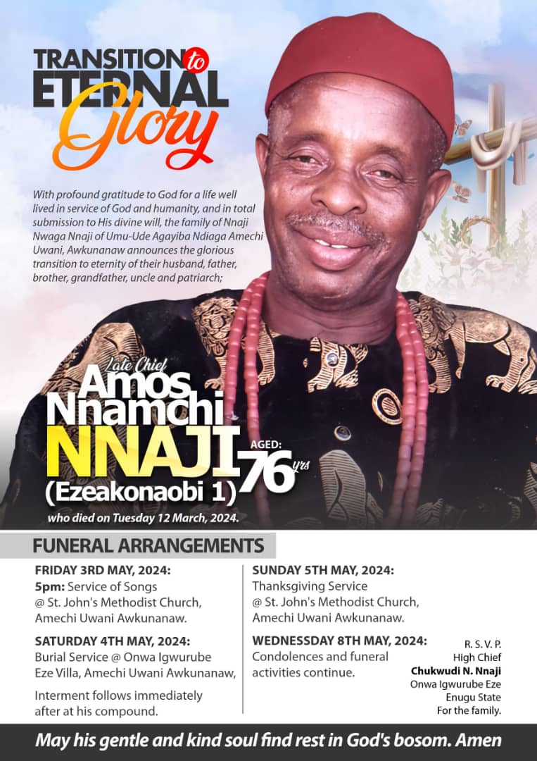 “With profound gratitude to God for a life well lived in service to God and humanity,and in total submission to His divine will,the family of Nnaji Nwaga Nnaji Umu-Ude Agayiba Ndiagu Amaechi Awkunanaw announces the glorious transition to eternity of their brother, husband,father,uncle, grandfather,and patriarch Late Chief Amos Nnamchi Nnaji (Ezeakonaobi 1) aged 76 whose death occurred on the 12th of March 2024.