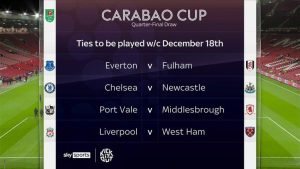 Chelsea to host Newcastle at Stamford Bridge in Carabao Cup quarter-finals; West Ham to visit Liverpool; Everton set to face Fulham; League One club Port Vale to welcome Championship side Middlesbrough; Ties will take place in the week commencing December 18.