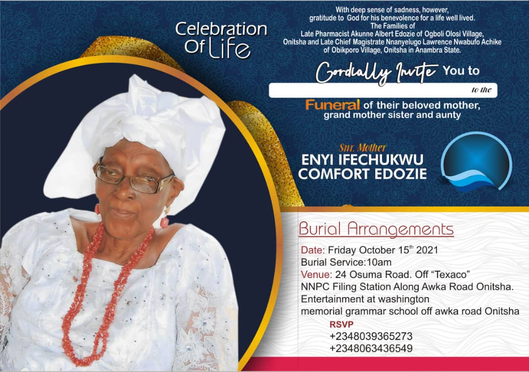 The remains of Enyi Comfort Ozoemena Edozie, is to be committed to mother earth at her residence in Onitsha, Anambra state , tomorrow.