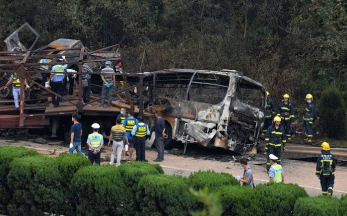 The accident happened in the early hours of Sunday, with the truck crossing the central divider in the middle of a highway in the eastern province of Jiangsu and colliding with a bus traveling in the opposite direction, causing the bus to overturn.