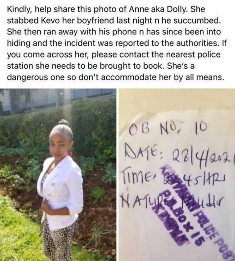 One Nyambura Kamami, believed to be a family member of the deceased, alleged that Anne stabbed Kelvin in the throat. He urged anyone with useful information on her whereabouts to contact the police.