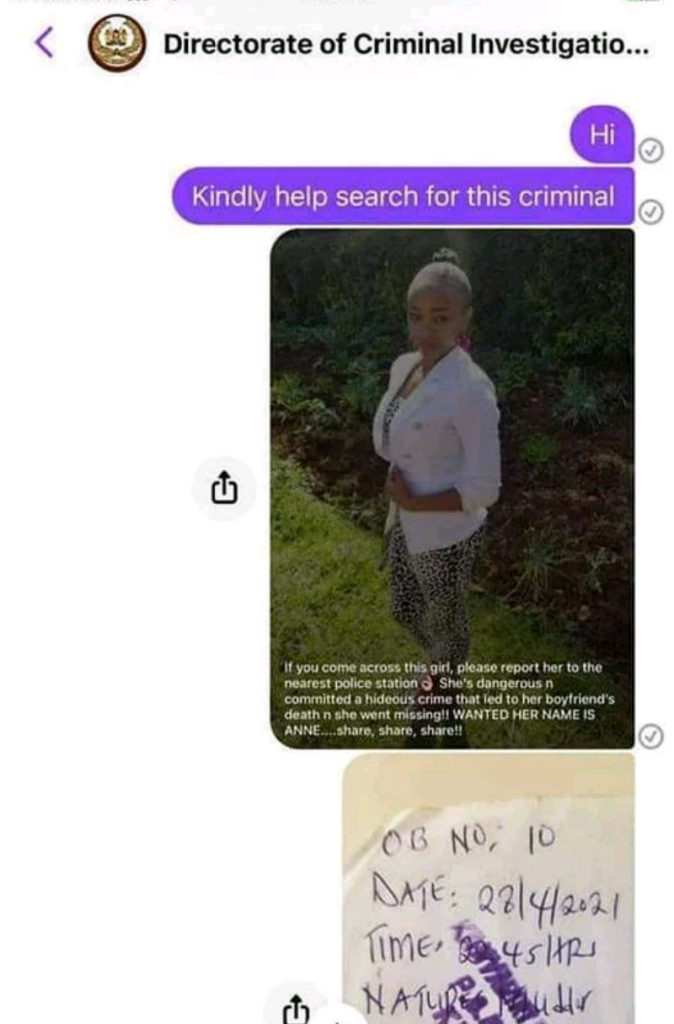 A 23-year-old woman identified as Anne has been declared wanted for the alleged murder of her boyfriend in Gitaru, Kiambu County, Kenya.